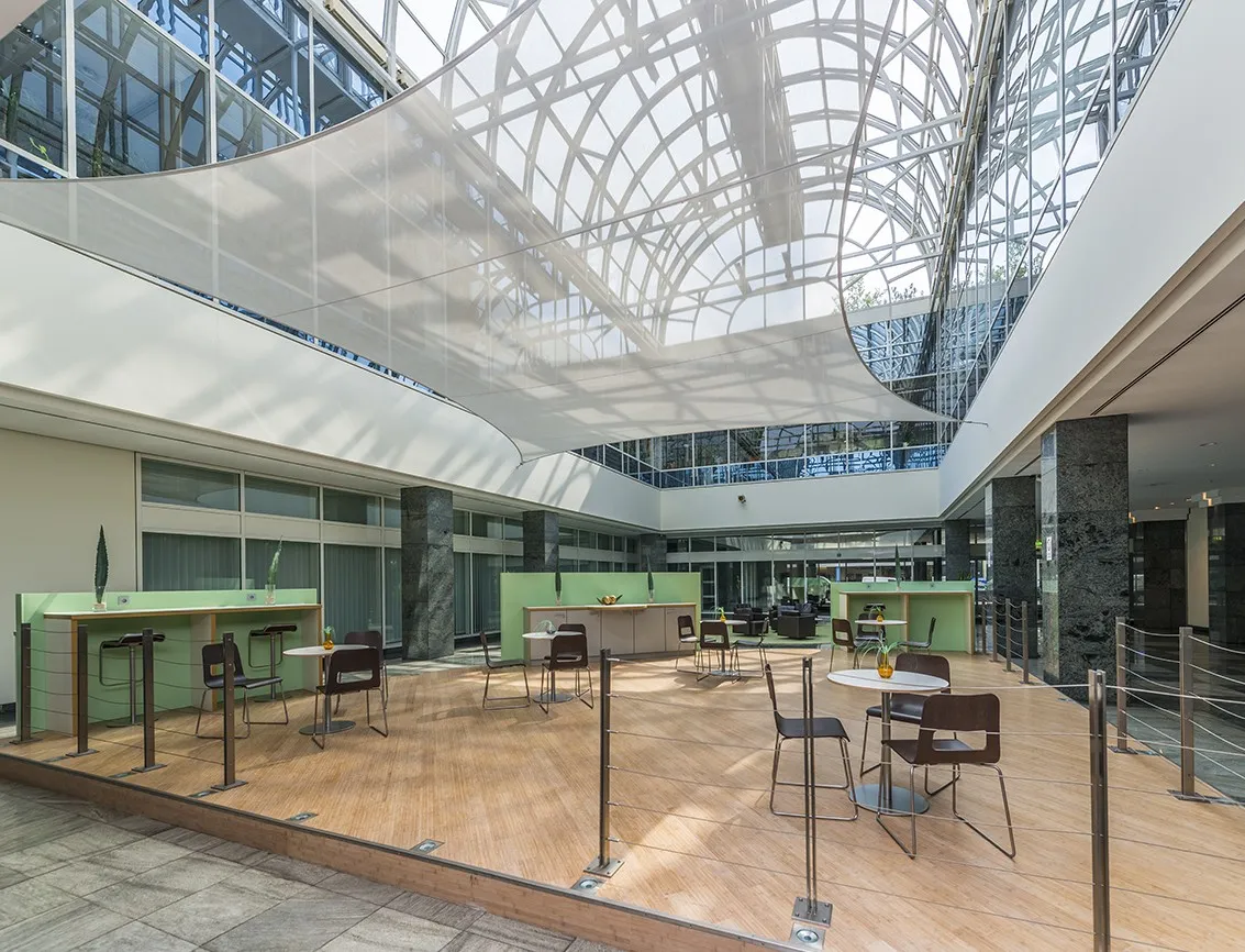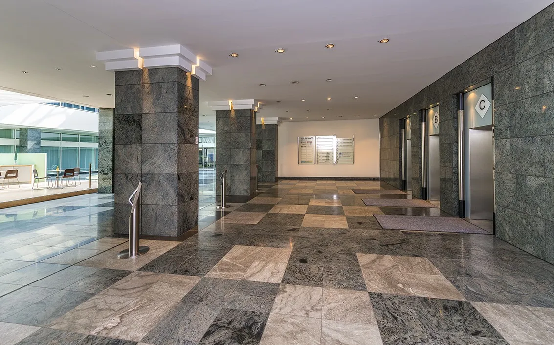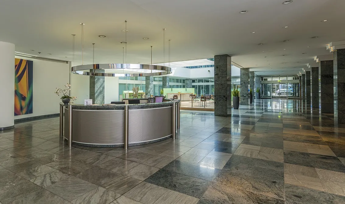 Drei Personenaufzüge (codegesteuert), öffenbare Fenster, Sonnenschutzisolierverglasung mit innenliegendem Blendschutz, Fensterbankverkabelung, abgehängte Decken mit BAP-Beleuchtung, flexible Trockenbauwände, Dreh-/Kippfenster, Damen-/Herren WC, Teeküche